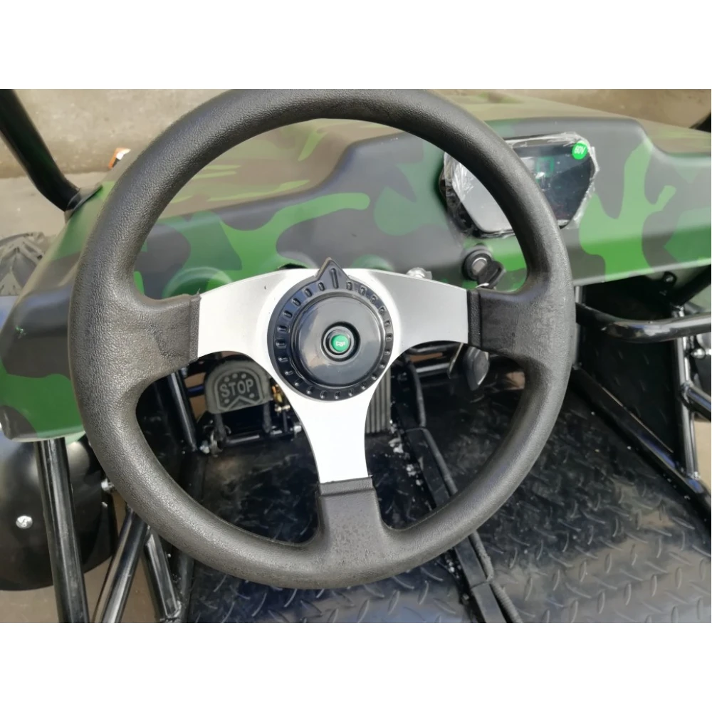 Техника представлена прочной и надежной конструкцией. Производитель акцентирует внимание на двигателе мощностью 1500 Вт. Улучшенные показатели мотора позволяют с легкостью набирать скорость 45 км/час. Для большей маневренности модель оснащена 3-х скоростным переключателем. Повышенная проходимость техники на дороге любого типа и покрытия обеспечивается высоким дорожным просветом. Багги имеет удобные сидения с функцией регулировки для длительных поездок без дискомфорта. Прочные ремни безопасности надежно фиксируют пассажира при езде. Измерение скоростных показателей обеспечивается современным LED спидометром.